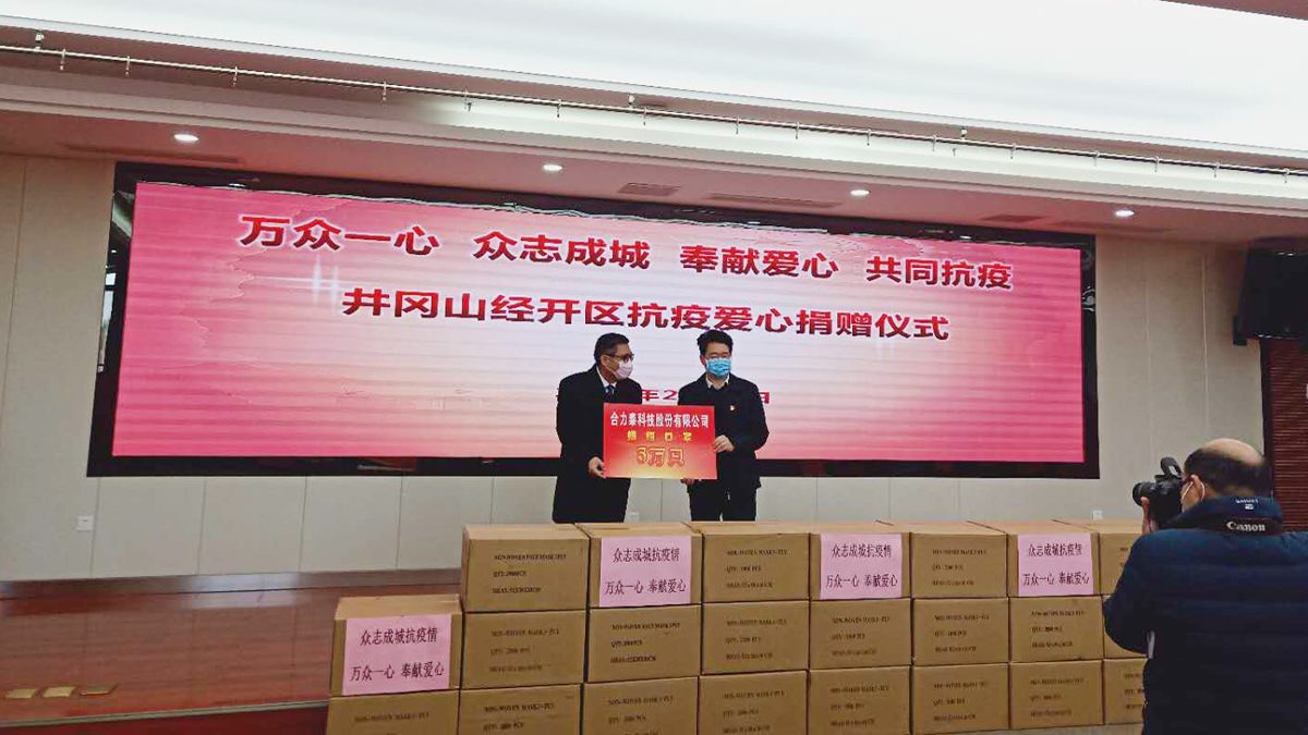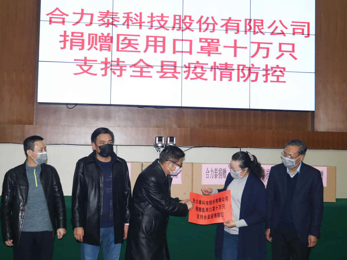 2月15日,合力泰向泰和縣捐贈十萬只口罩,泰和縣副縣長肖紅向合力泰表示感謝,并表示將以最快速度將捐贈物資送至抗疫一線。